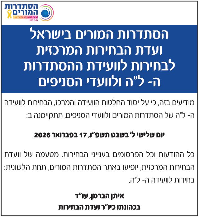 דף הבית > מה חדש > חדשות > בחירות לוועידה ה- ל"ה של הסתדרות המורים ולוועדי הסניפים בחירות לוועידה ה- ל"ה של הסתדרות המורים ולוועדי הסניפים בחירות לוועידה ה- ל"ה מחבר:הסתדרות המורים 11:53 12/11/2025 הוועדה לטוהר הבחירות הודעה מספר 001 בחירות לוועידה ה- ל"ה 13:35 23/11/2025 בחירות לוועידה ה- ל"ה של הסתדרות המורים ולוועדי הסניפים בחירות לוועידה ה- ל"ה 11:53 12/11/2025 חדשות אחרונות הוועדה לטוהר הבחירות הודעה מספר 001 בחירות לוועידה ה- ל"ה 13:35 23/11/2025 סיור בצפון – לפגוש את השליחות מקרוב ידיעות כלליות 19:26 19/11/2025 נהריה כרמיאל סיור מקצועי במחוז מנח"י – ירושלים ידיעות כלליות 16:57 19/11/2025 לכל החדשות